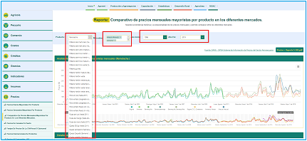 | Alfredo: Ya en el reporte, encontrará un filtro que le muestra una lista de productos agropecuarios. Elija el producto que usted quiere consultar y haga clic sobre él, luego seleccionar el mercado o los mercados en los que quiere ver el comportamiento del producto y el periodo en años inicial y final. Para este ejemplo, vamos a consultar la "arveja verde en vaina", seleccionando el producto. |