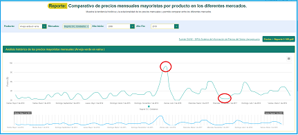 Alfredo: La línea azul del centro está indicando cómo ha sido el precio del producto. En este caso, para la arveja verde en vaina, el precio más bajo ha estado cerca a $2600 en el mes de Enero y el precio más alto por encima de los $4700 en el mes de Abril.